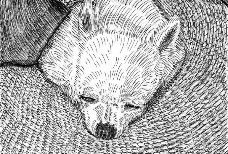 我が家の愛犬、オスのチワワ、ルカです。以前投稿した、ジュピターとアリスとの間に生まれた子供です。現在13歳、誕生日を迎えれば14歳になります。人間で言えばおじいちゃんであり、実際目がほぼ見えておらず、心臓が弱かったり認知症も患っています。ただ、ゆっくりながらも自分の足で歩けて、ご飯をちゃんと食べられて、しっかり排泄も出来ています。そして今でも頭や身体を撫でると、嬉しそうに尻尾を振ってくれます。自分にとっては、ある意味弟のような存在です。今回描いてみて、母親のアリスに似てきたと、改めて感じました。以前はチョコフォやジュピターと喧嘩をすることもありましたが、オス一匹だけになり、性格も目つきもすっかり柔らかくなりました。どうか両親やチョコフォの分まで、長生きして欲しいです。
