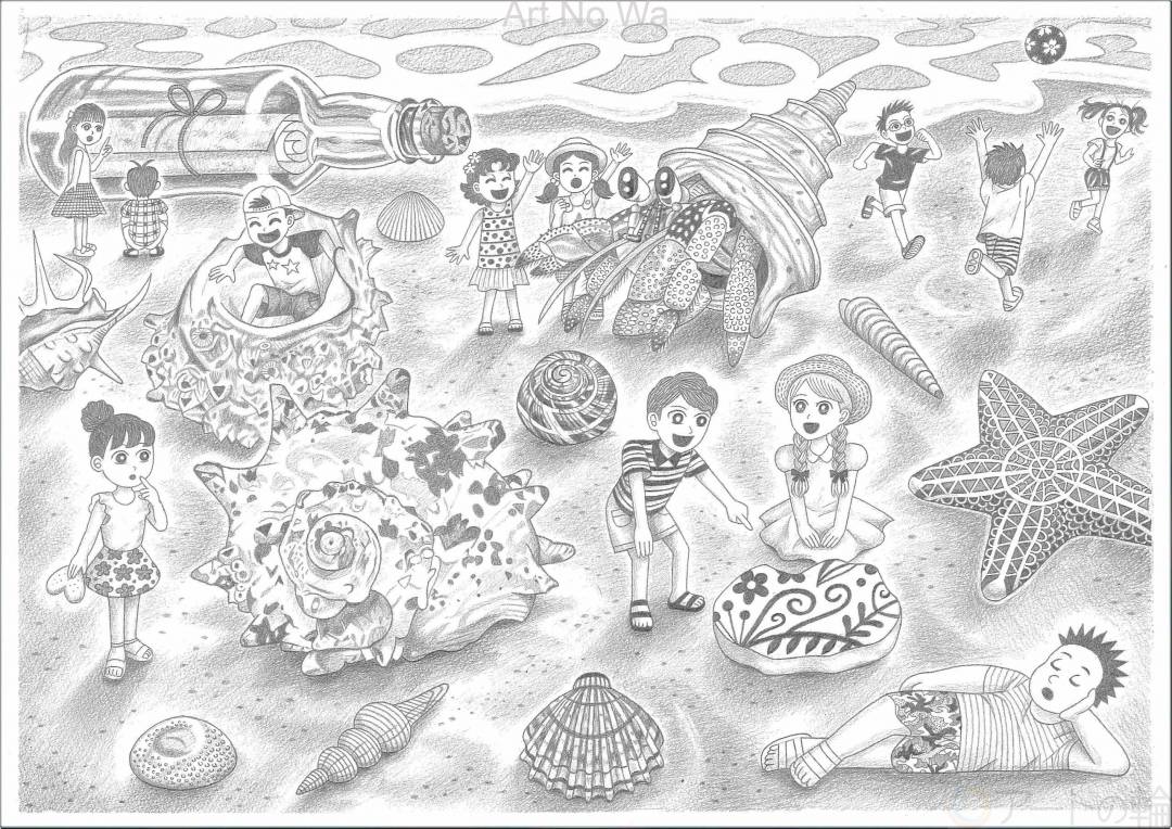 海辺で遊ぶ小人達を鉛筆のみで描きました。貝殻、ヤドカリ、ヒトデ、模様の入った陶器の欠片など、小人の視点ならではのビッグサイズ感を意識しました。一緒に楽しそうにしている少年少女を、物陰から女の子が切なそうに立っている。片思いする男の子にハート形の砂を渡したいのに・・・大きい貝殻に潜り込む子や、ぐーすか眠る子、優しいヤドカリさんと遊ぶ女の子達、スーパーボールで遊ぶ子達。それぞれが楽しく過ごしています。おやおや、砂浜にボトルメッセージが流れ着きました。中にはどんな事が書かれているのでしょう?楽しい物語が始まる予感ですね。