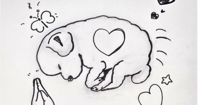犬が眠りながら家族の幸せを祈っている様子を描きました。ハートは家族からの愛をイメージして描きました。