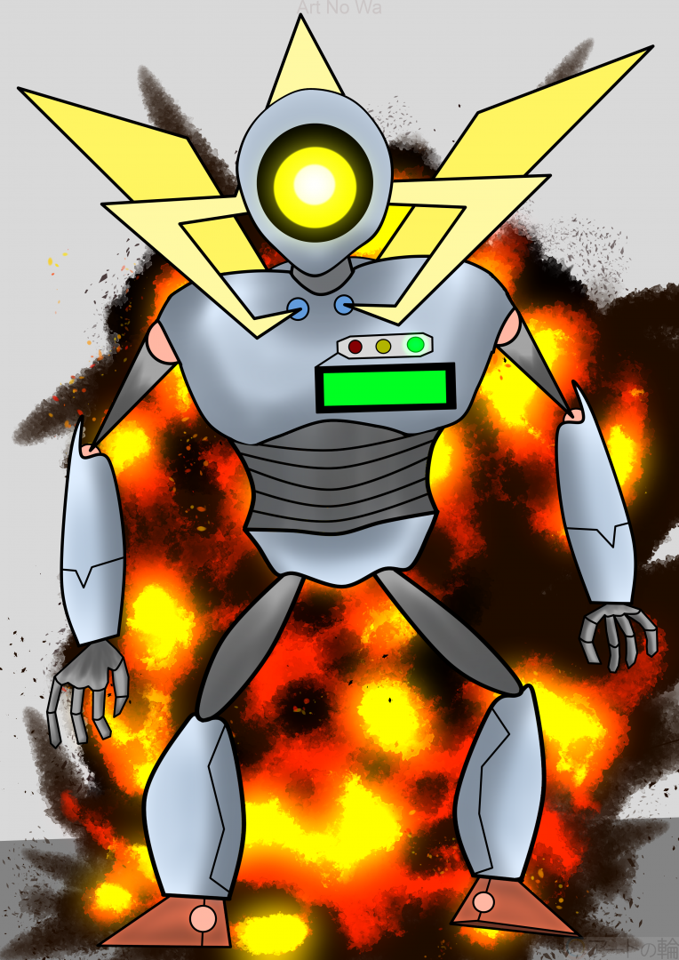 今回は戦闘ロボが爆発した所の前から現れたシーンをイメージして描きました、ロボットの形や後ろの爆発が良い感じにかけました。設定の詳細:このロボットは“メカニックファクトリー”社と言う企業が生み出したロボットだ、このロボは状況判断能力があり様々な状況に合わせて対応してくれます、戦闘能力はとても高く、レーザー光線や格闘技術を活かした戦闘をします、主な役割は部隊を編成し治安を乱す凶悪なモンスター達の無力化や撃退が彼らの主な役割です。ここまで見て頂いてくれた皆様、ありがとうございました。
