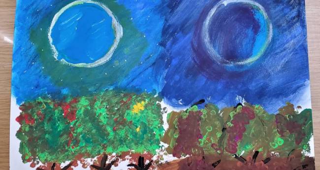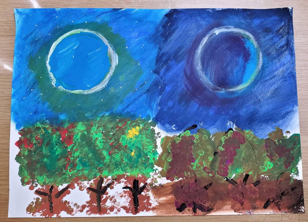 綺麗だった草木や地球も地球温暖化が進むと薄暗く木々も枯れていくところをイメージして書きました!僕たちにできることは左側の綺麗な地球や木々たちを保つことだと思います!という気持ちを込めて書きました!
