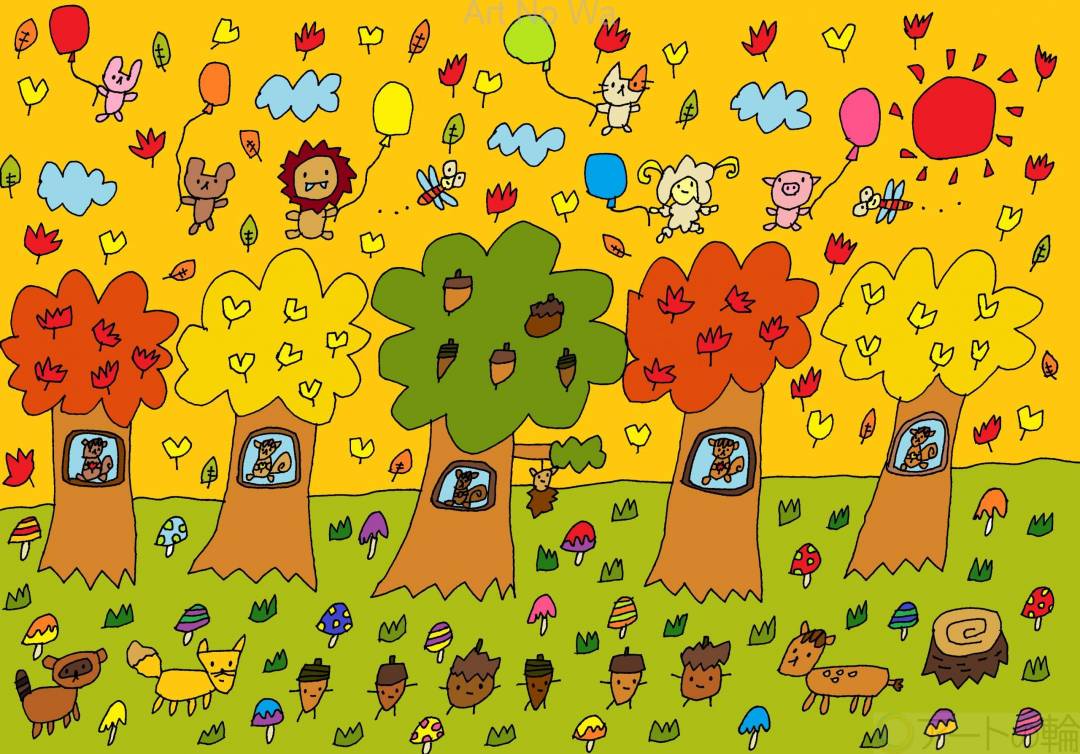動物たちがみんなで紅葉狩りをしているところを描きました。