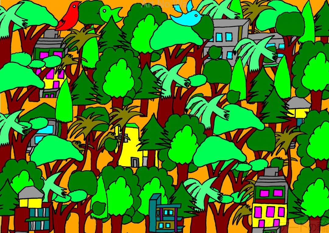 「今の緑を木を伐採しているところが自然破壊につながる。」と思い、「木や緑がたくさんあるところに街があれば、みんなが住みやすくて自然破壊がなくなるのかな。」と、創造して描きました。