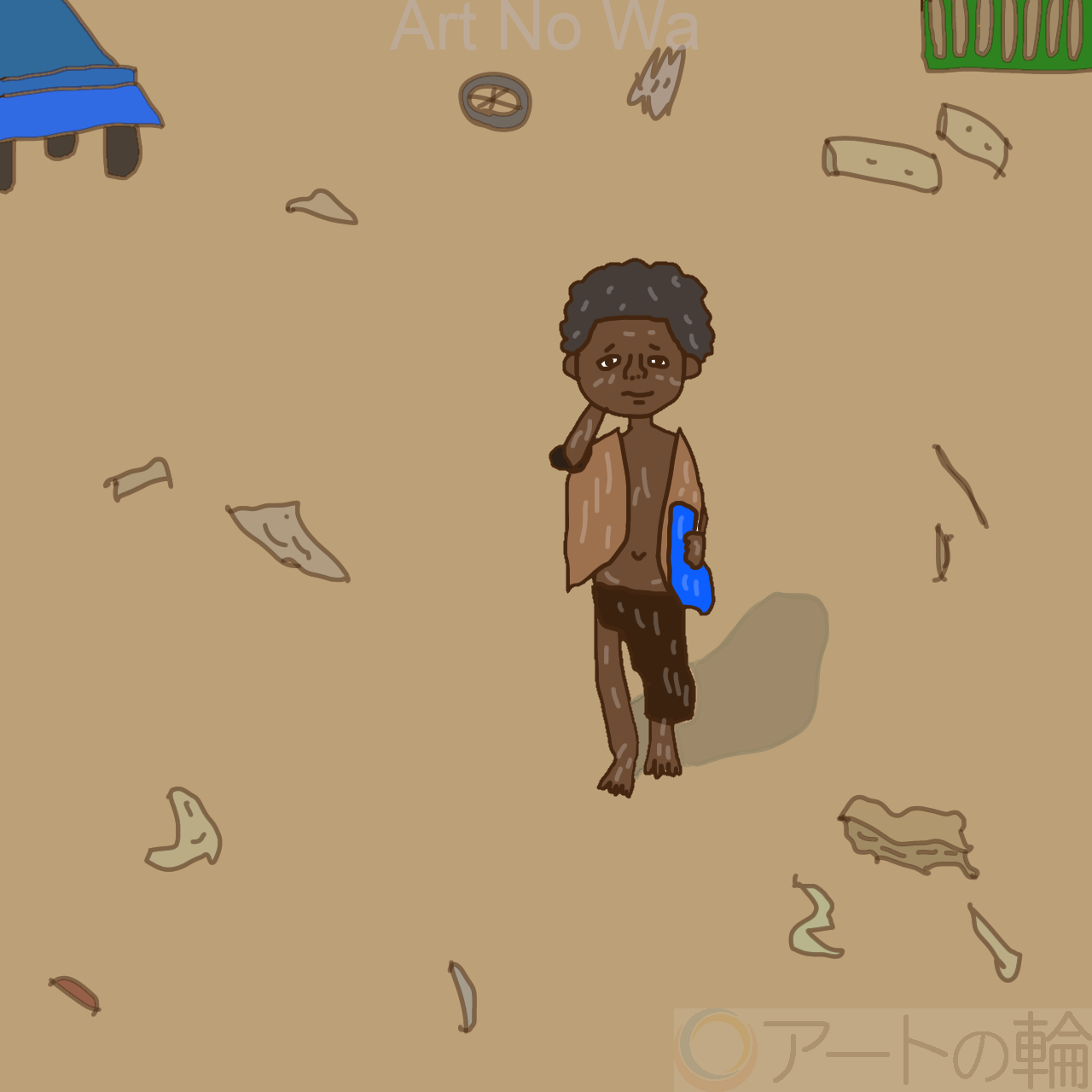 衣食住。もしかすると、それは、当たり前じゃないのかもしれない。お腹いっぱいにごはんを食べることが難しい。そんな、男の子の日常を想像して描いてみました。