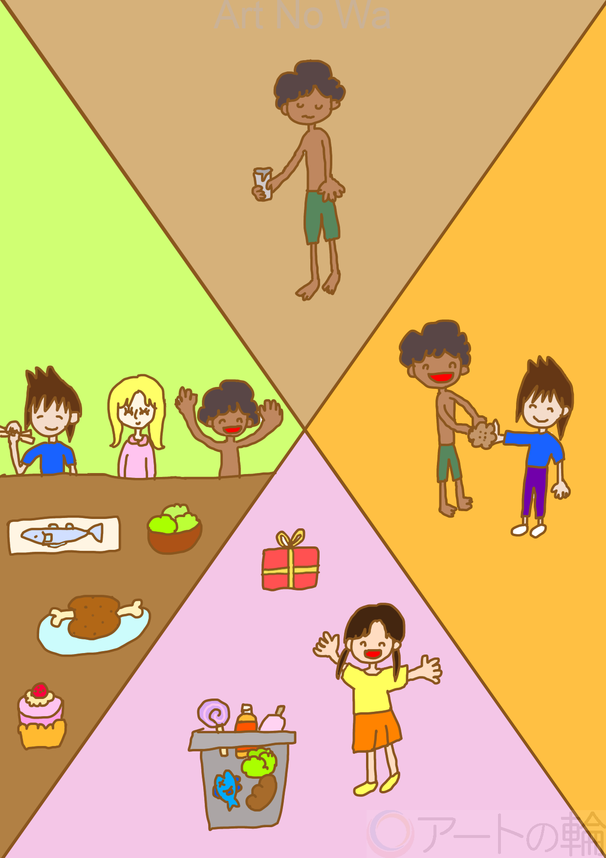 おなかを空かせている人も、 たべものを余らせて捨てている人もいる。 でも、本当はみんなで分け合えるといいな。 ごちそうをみんなで分け合うのもいいし、 ビスケット1枚でも半分にして分け合えるような世界になればいいな。