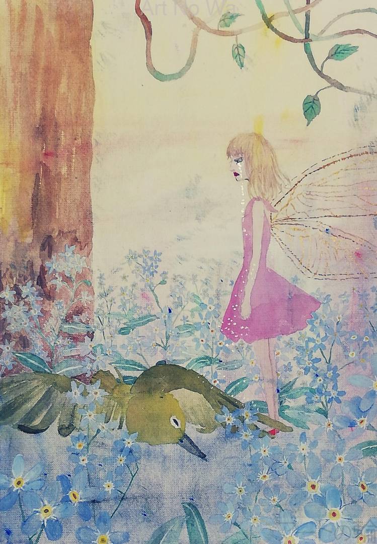 ずいぶん前、庭にメジロが落ちていました。そのメジロは生きていました。拾って手のひらに乗せたとき、軽さにとても驚きました。ベランダに連れていき、しばらく見守っていると目を開けて、ぱぱっと飛んでいきました。野鳥の寿命は長くはありません。もしメジロと友達の妖精がいたら、きっと妖精はその死を悲しむでしょう。私の中の妖精は不変と不死の象徴です。死を悲しむことは当たり前のことのように思えますが、私達の実際の生活に当てはめたとき、心から誰かの死を悲しんで泣く人は多くないように感じます。