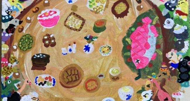 森に住む動物達が大きな切り株のテーブルに座って一緒に食事をします。みんな仲良しです。