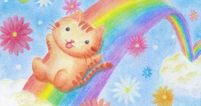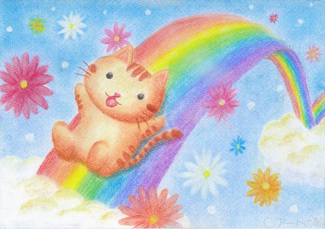未来へ続く虹の橋を、楽しそうにすべって進んでいく猫ちゃんを描きました。明日へ続く道は色とりどりのお花に囲まれ、ワクワクドキドキです。
