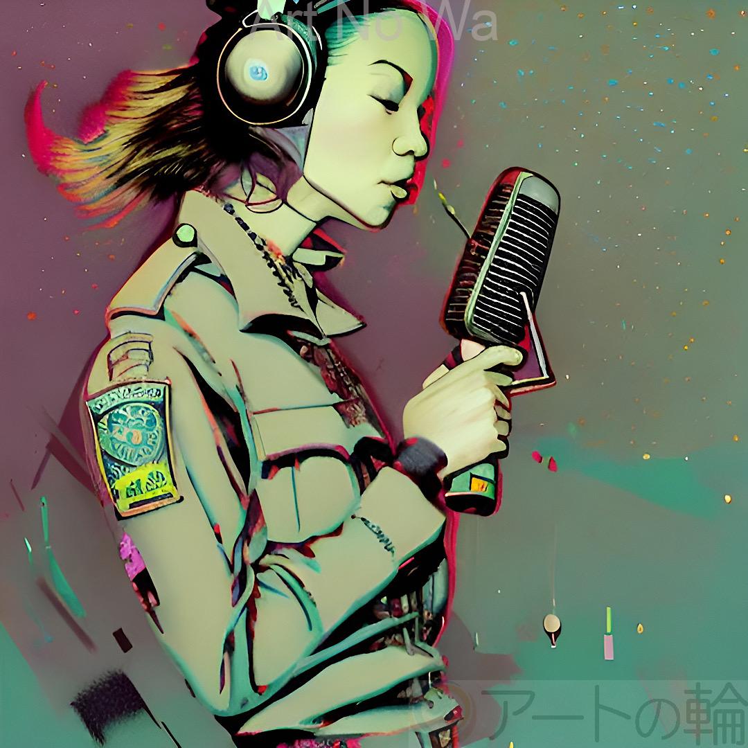 have a chronic illness that causes my muscles to atrophy, and I write #AIArt while wearing a ventilator and recuperating at home. Music is a part of city life, and I created DJ Police. “Banksy’s ink drawing of a beautiful police girl holding a DJ microphone with shading on her breasts.”