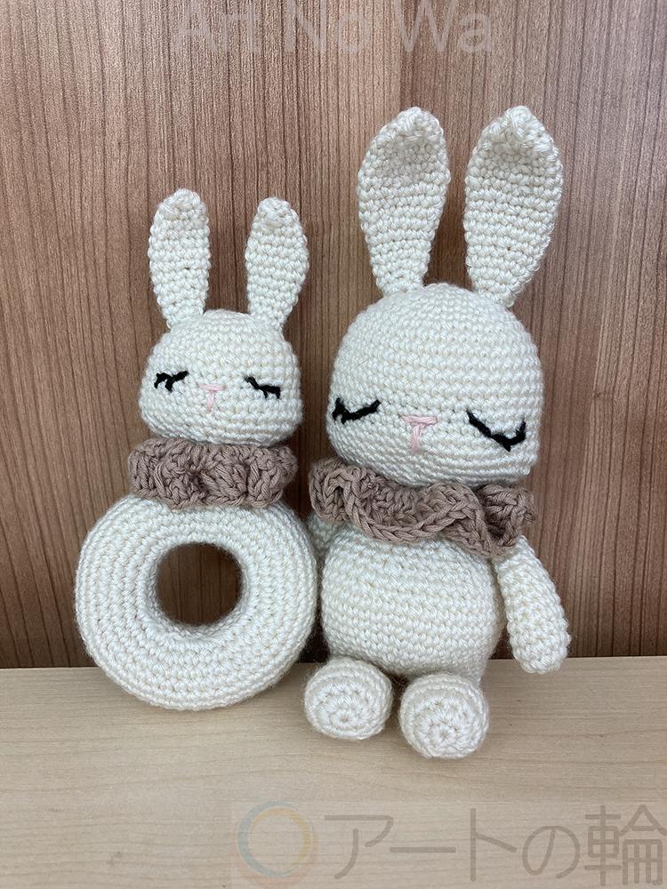 ベビー用品のうさぎの編みぐるみとうさぎのガラガラのセットです。