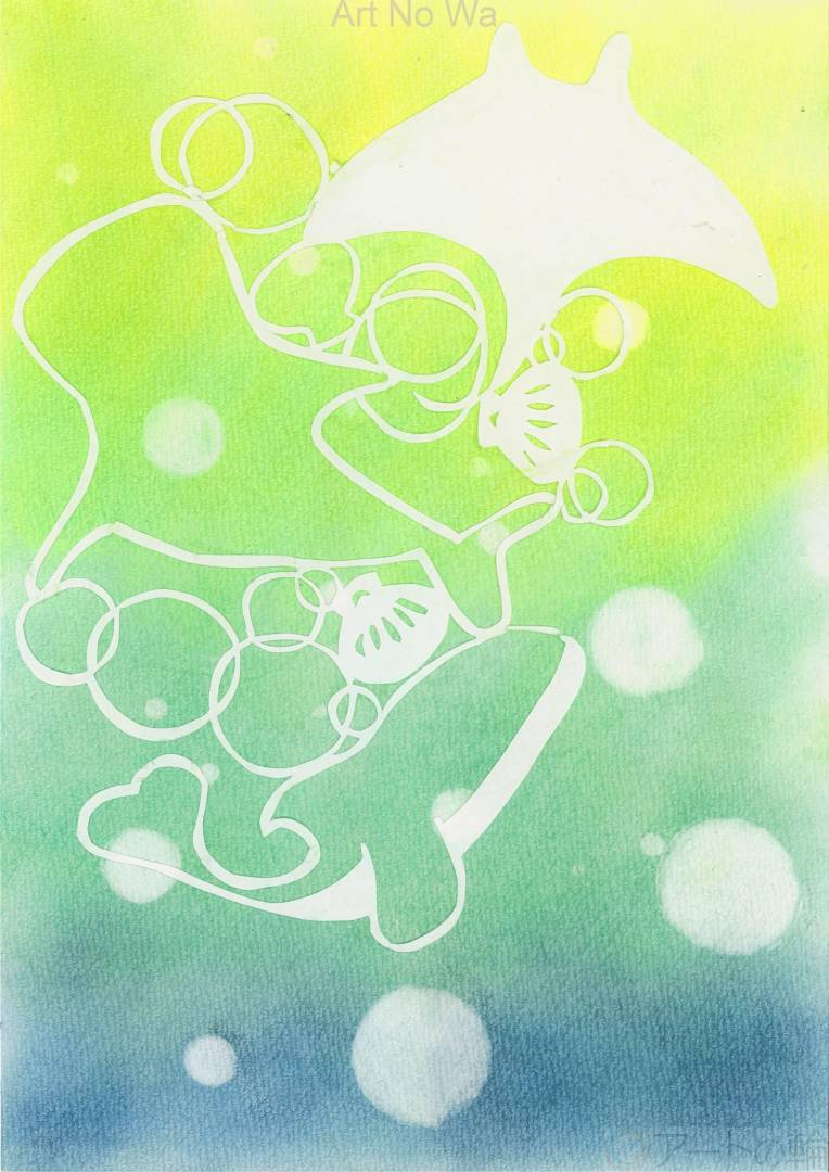 エイとジンベイザメとクジラの子供達が楽しそうに泳ぎながら遊んでいる姿を切り絵で表現しました