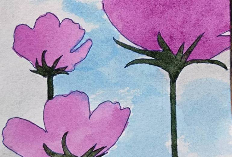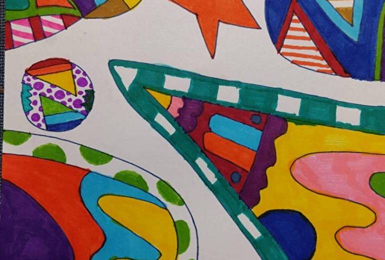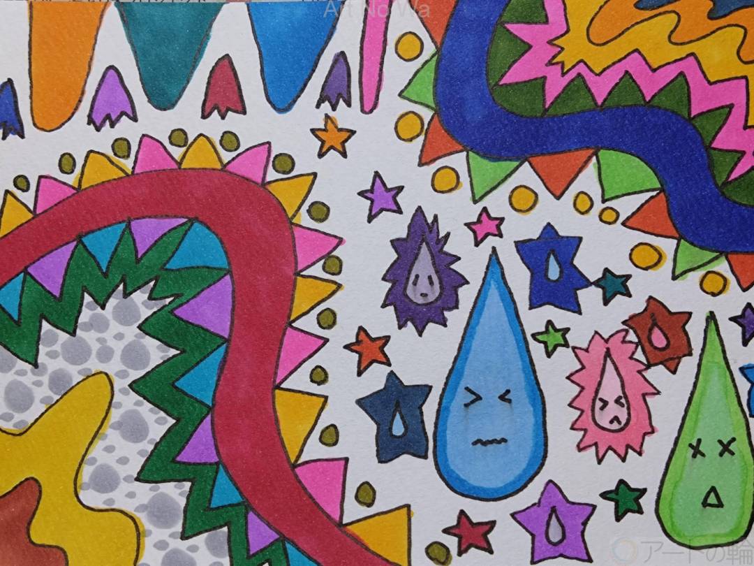 過去にあった嫌な出来事もいじめも全部、自分1人では消化できず、未だに悪夢として顔を出す。今現在つらい状況にいなくてもずっとずっと、心の中で「傷」・「痛み」として、闇を生んでいる。堕ちたときは気持ちがしんどくなり、希死念慮が生まれることもある。そんなときは悲しくなり、周りのことなんて考えられないくらいに鬱になる。そして、自分の生き方さえ危うくなる。そんな思いから、現在も深く心に刻まれてる傷をトゲトゲに、悲しみを雫(涙)に、暗い色でつらい状態・様子を表した。所々明るい色を塗ったのは、堕ちから完全に回復すれば気持ちも穏やかになることもあるから。そのときは鬱の気持ちも和らぐ。