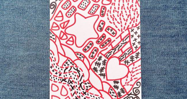 何も見ず下描き一切なし一発描きで、自分で考えて描いた作品です。線は赤色油性ペンで描き、模様は黒色水彩ペンを使って描きました。紙のサイズはハガキサイズ白色の紙です。