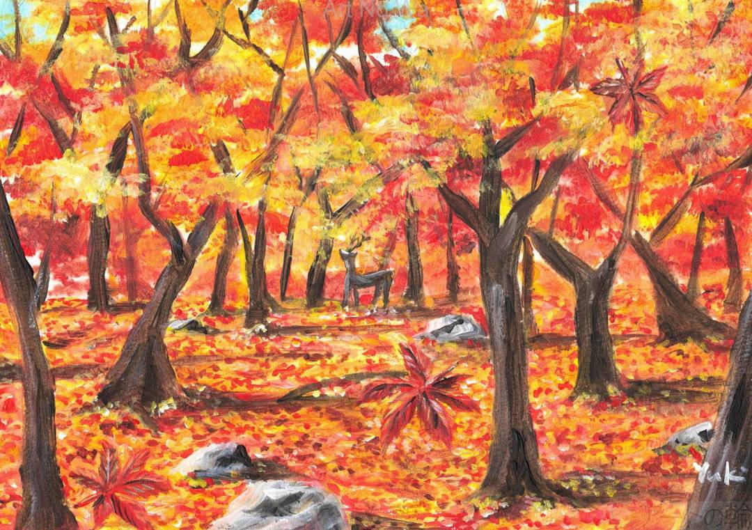 百人一首のある歌のイメージです。鹿の鳴く声が響く秋の寂しさと、同時にある景色の美しさを大切にしました。