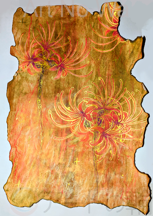 「赤い花…なんと気持ち悪い」或る国の大臣が、政庁の庭に咲く赤い花に吐き捨てた。そして宮廷お抱えの呪術師に縋る。「目堂院、一族を『赤の神(アカサカシカミ)』から遠ざけるにはどうしたら…」赤の神。災いをもたらす邪神として貴族の間で恐れられていた。目堂院と呼ばれる呪術師は言う。「しかし、赤の神は元来力を司る…」「力は下々に任せれば良い!今は息子と皇族の姫君との大事な縁談がある。今すぐにでも孫の顔が見たいのじゃ。私も長患いの身ゆえいつ命尽きるか分からぬ。何卒!」「…承知致しました」目堂院は目を閉じ、精神を統一しつつ詠唱する。✺◈▼サダナヲフ カナタビトへ▲◈✺突如庭の赤い花が一人でに燃え、たちまち灰となった。「あやや…」「赤の神を別の場所に行かせる呪文で御座います。この花は毒があります故、燃える事で災いが取り除かれたと言えましょう」「助かった。これで一族は安泰じゃ」 しかしその望みは叶わなかった。翌日「大臣が3件の暗殺事件を企てた」として朝廷から火炙りの刑が言い渡されたという。密告したのはなんと息子だった。息子は処刑場で大臣に詰め寄る。「よくも『実の』両親をあやめてくれたな。帝の右腕までにも手をかけおって…」「目堂院!何故呪文が効かぬか」縛られた大臣の叫びに目堂院は答えた。「むしろ何故災いを他人に投げつけるのです。災いと縁を切りたいと願ったのは貴方でしょうに。おや…」目堂院は或ることに気づく。「貴方は恐らく、火炙りにならずとも孫の顔を見る前に亡くなっていたでしょう」「何?」「長患いの病、確か内臓の不調。内臓に出来る瘤と言いましょうか…腹部に、いや心の臓も含む全身に球根の気配を感じます。赤い花の…」「何だと!」「今まで呪文で避けてきた『怨念』が貴方の…」「そんな…」意気消沈した大臣の足元の藁に火が灯される。その炎は赤い花の如く燃え盛る。息子は述べた。「赤は美しい。やはり赤の神を信じてよかった…」後に息子は帝の側近となった。/画用紙を炙ったものに彼岸花を描きました。赤から連想させるイメージは災いとも力とも取れるところから、灰塵と散るという災いと煌々と咲く花の対比を表現しております。