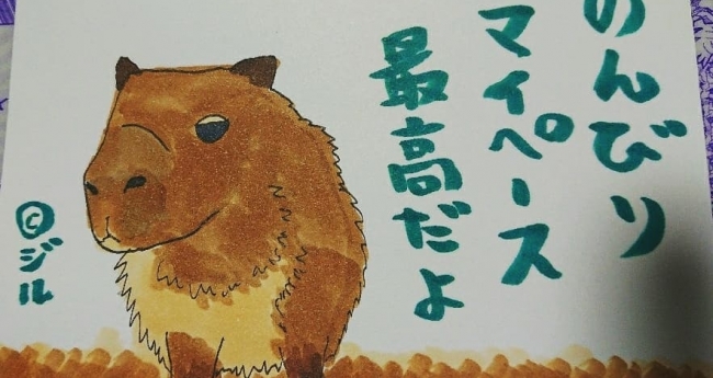 写真見本に描いた。自作メッセージ付きの初描き。カピバラがのんびりしてるから、それに合った言葉を考えた。