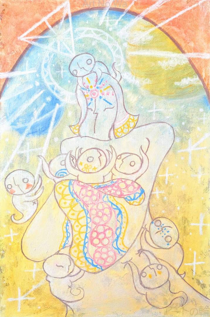 天の御国にいらっしゃる主神オモカミ様。オモカミ様にはワラワゴ様という沢山の子どもがいらっしゃいます。オモカミ様はワラワゴ様たちを心から愛し、ワラワゴ様たちもオモカミ様を愛しております。「ねね、あちゃ。きいきゃ (ねえ、おかあさん。きいてきいて) 」「ねね、あちゃ。みいみゃ (ねえ、おかあさん。みてみて) 」「 ねね、あちゃ。ちょおらいにゃ (ねえ、おかあさん。ちょうだいな) 」「ねね、あちゃ。だっこっこゃ (ねえ、おかあさん。だっこだっこ) 」「ねね、あちゃ。ああちっちゃ (ねえ、おかあさん。だいすき) 」ワラワゴ様たちは皆そう口にいたします。 一方で左にいらっしゃるあかね色の頬のワラワゴ様は、何を御覧になっているのでしょうか。 なぜだかオモカミ様の方ではなく下の方をご覧になっています。きっと下で沢山のカラフルな何かが歩いているのが気になるのでしょう。それでもオモカミ様は何も仰せられません。 怒りも窘めもせず、ただそのワラワゴ様の存在を感じ取って優しく微笑んでおります。ワラワゴ様が御覧じていたのは一体何だったのでしょう?▼▼▼今回は柔らかい布地を張ってから描いてみました。帆布を使ったキャンバスならよく見かけますが、柄付きのキャンバスはあまり見ないはずです。パステル画の下に透けて見える柔らかい草花の柄。 それも作品のパーツとして楽しめる作品となっております。