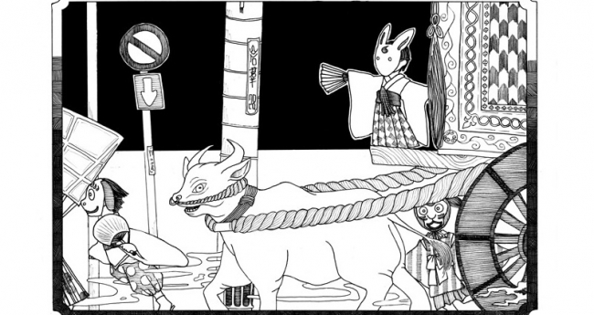 『描人同盟』に寄稿させていただきました作品です。テーマは神様でした。扇子、団扇、渋団扇など、『煽ぐ』ものを持ち寄っていることが印象に残る絵にしたいと思いました。そしてそこから猿の面をつけている子が持っているものを想像していただきたいとも。
