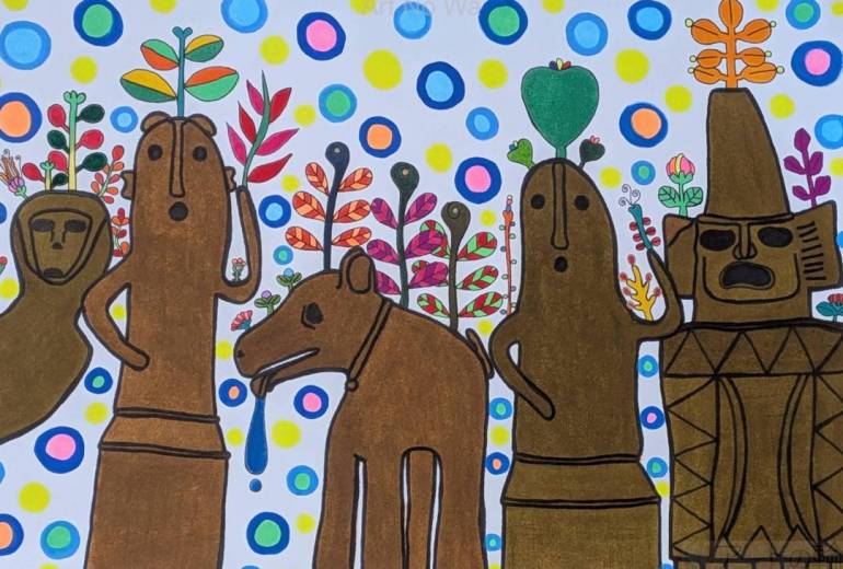 お花畑でお友達の鳥さんと宝物のお魚さんと一緒に記念撮影をするクマさんの様子を想像して描きました。