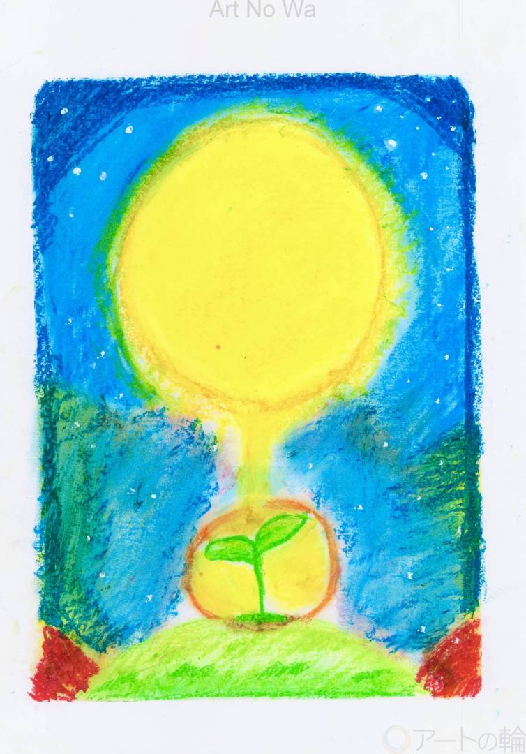 令和6年1月1日16時10分に発生した石川県能登地方を震源とするマグニチュード7.6の能登半島地震が起き、多くの方が被災し大切なものを失い今も不安を抱えて暮らしていらっしゃると思います。 でも、どんな困難のなかでも人は前向きに捉え希望を見いだし前を向いて歩いていけます 月の光に照らされた種子が芽生え形となって大きく根強い幸せを運んでくれる様子を表現しました 「幸せ」という言葉は「し合わす」という言葉が変化して生まれたそうです。 「し合わす」とは「巡り合わせ」の意味だそうで、たとえ悪いことに巡り合っても、それを乗り越えた先の喜びを「幸せ」と呼ぶのだそうです。 石川県の皆さんが当たり前にある「日常」を取り戻し、幸せな日々を過ごせますようにと思いを込めて描きました。