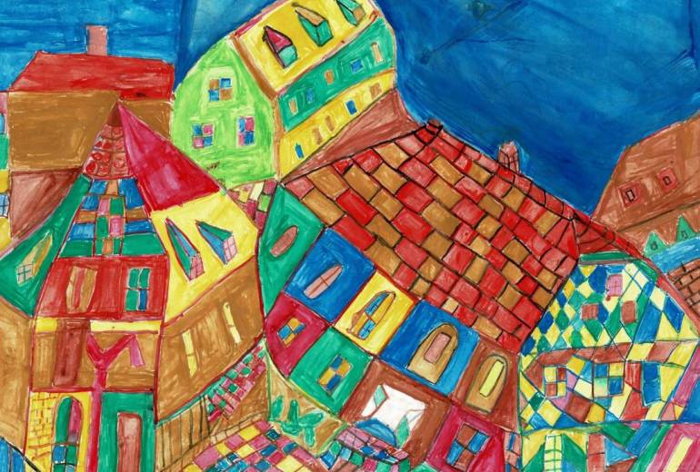 中心に大きな桜の木を描きました。近くにみかんも描きました。