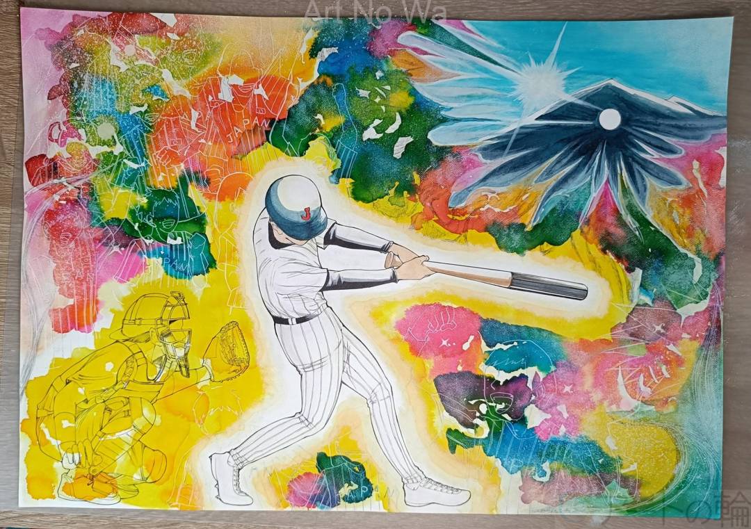 最近はデジタルで作画することが多くなりましたが、インクの自然な『にじみ』が、応援の『炎』を表現するのに最適かと思い、アナログで挑戦させていただきました。デジタルとは違い、やり直しができませんので、一つ一つの作業工程の終わりから次の工程へ始めるまでの気力を整えるのに時間もかかりました。各工程を付箋に書き、どう進めていけばいいのか、最終的にこれでいいのか、時間割を決めていきましたが、なかなか時間通りにはいかず、結局、終わりが見えなくなりました。野球も普段はよくアプリで見ます。年に一度ほどですが、球場に足を運びます。はじめにバッターを描きました。下描きの時に何度もやり直しをして、野球に詳しい知人に聞きながら、何とかデッサンを完成させることができました。キャッチャー同様です。力の入ったその瞬間を描くのは、とても難しかったです。大きく叫んでも小さな声ではありますが、届きますように。