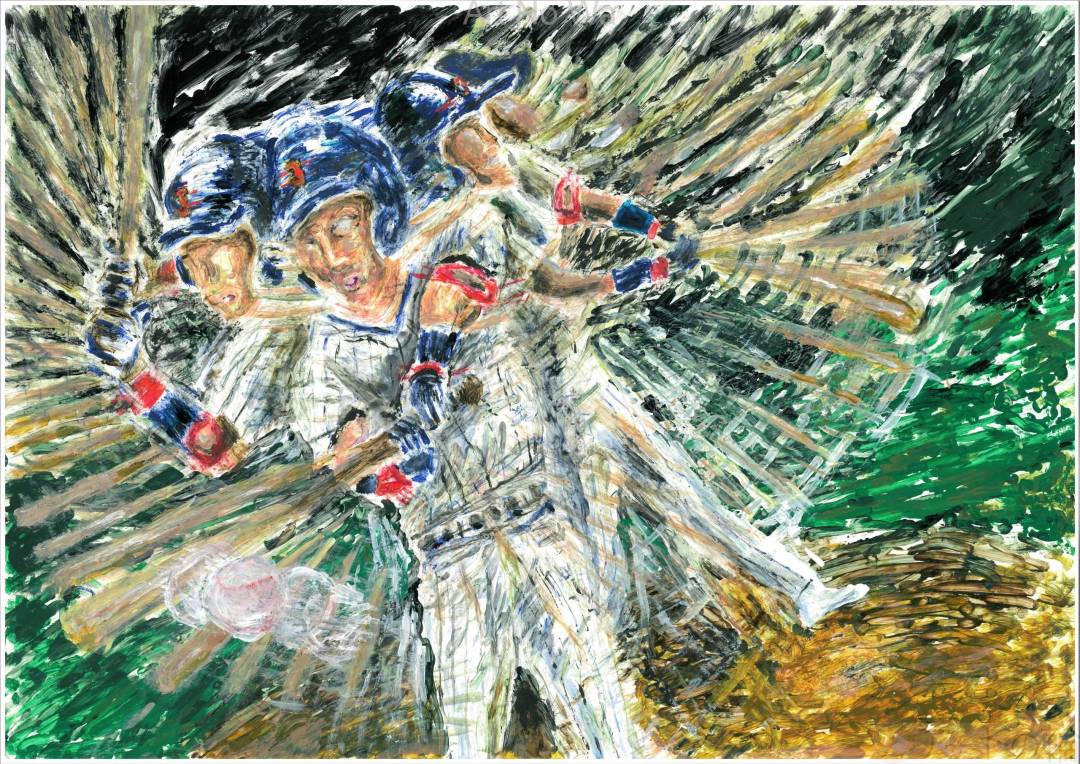 この絵は水をあまり使わず絵の具の質感や筆跡などを残し荒々しく描き、コマ送りのようにスイングの残影を描いていくことで、一瞬も見逃せないプレーの躍動感を表現できればと思い描いていきました。また、この絵はA3の大きな画用紙に描いていきました。今までA3画用紙に描くことはなかったのですが、今回侍ジャパンがテーマであり、世界一に挑戦する侍JAPANのように自分に限界をつくらず新しいことに挑戦してみました。今回挑戦してみたことで自信になり、今後もA3画用紙を使ったり、自分に限界をつくらず他にも様々なことに挑戦していきたいと思えていて自分の可能性を広げることができました。