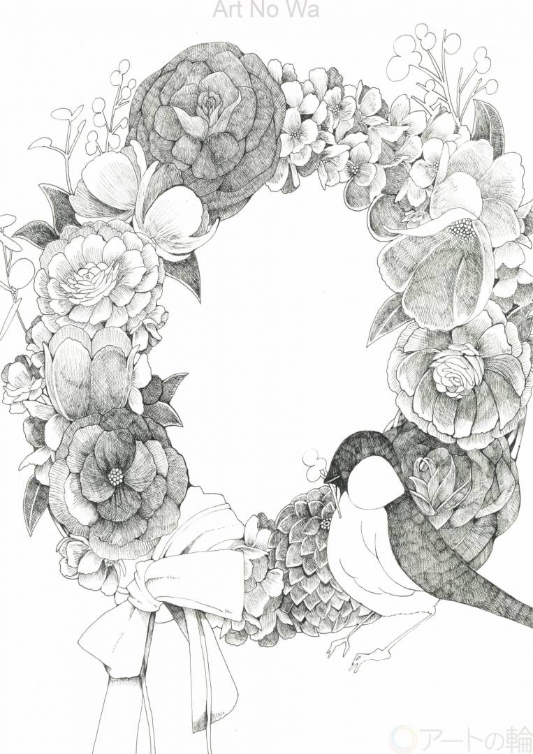 公募テーマが「あなたの宝物」なので私自身(或いは多くの人にとってそうかもしれない)の宝物の「よすが(縁、心の拠り所とするもの)」を想像し主題といたしました。人は多くの縁や関係性を通じて傷つきあるいは歓びを得る事ができる。様々な人々との関係を植物や花で表しリースにする事で循環・繋がってゆく未来を表現した。枝葉をくわえている鳥は作者または「あなた」で、宝物はその鳥が居る事で完成する。華やかで細密なペン画で描かれている。白黒のままなのはこれからの未来の行動で「よすが」も色づくよう願って制作されたから。