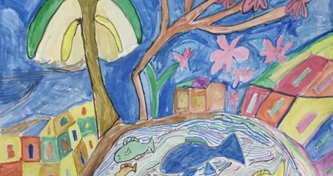 魚がたくさん泳いでいる港と大きな桜の木を描きました。