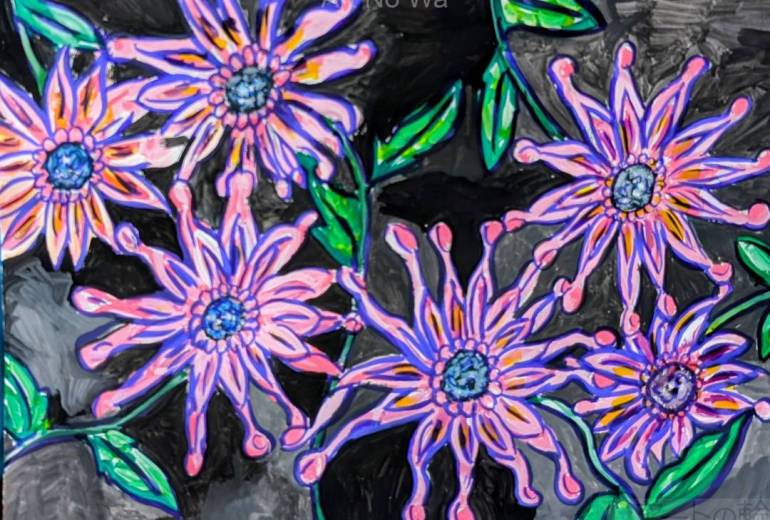 小学3年生の頃学校の先生が読書感想画のコンクールをすすめて参加したら入賞したきっかけで母のすすめもあり絵を描くのが好きになりました。特に花が好きで紙に大好きな花…