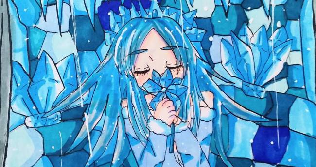 氷の花をもって氷の世界で何かを祈っている女性を描いてみました。肌はコピックマーカーで、その他の色は他のイラストマーカーで塗っています。
