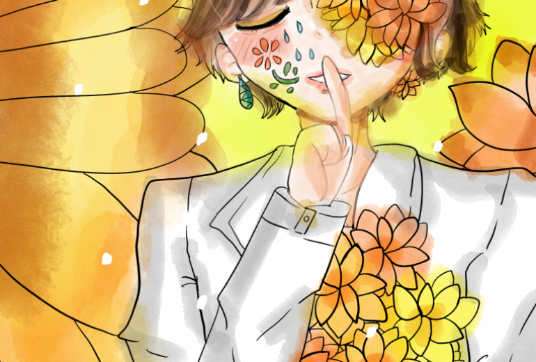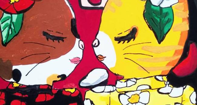 赤と白のツバキで和風に乙女チックに可愛い猫の女の子を描いてみました。下書きはシャープペンシルで、なぞりは、百均のマジックペンとポスカの黒色で、色は、ターナー色彩のアクリルガッシュで塗りました。