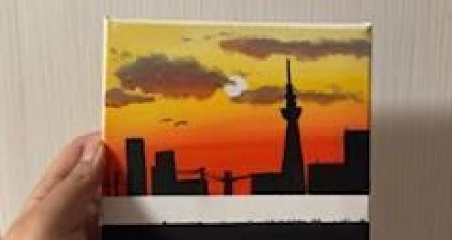 スカイツリーを主に、夕焼けと都会のイメージして描きました