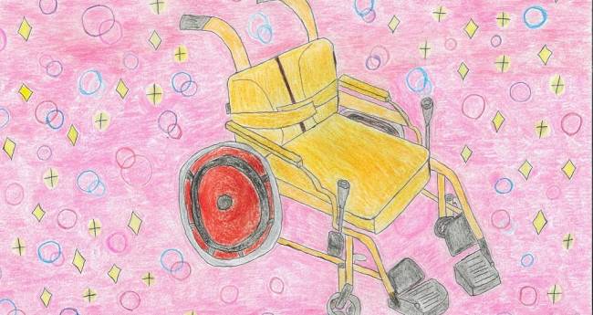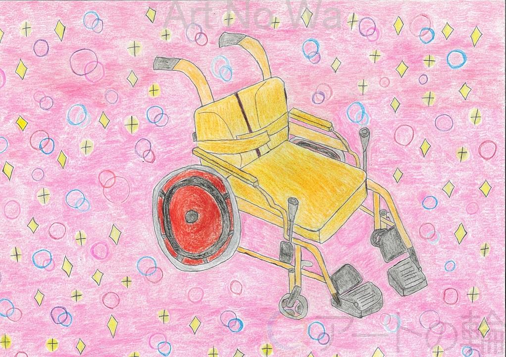 私は車いすがないと自由に移動が出来ません。この車いすは私の一番の宝物であり、かけがえのないものです。色鉛筆を使い、カラフルに、そして親しみを込めて描きました