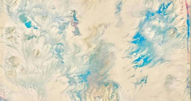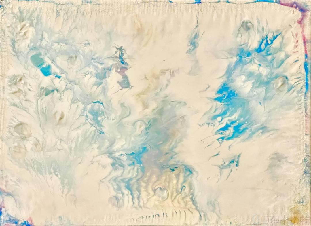 キャンバスにアクリル絵の具を画面全体にのせたのですが、再利用したキャンバスだったためか乾かず、版画にすることにしました。すると、キャンバスに残った絵の具が思いがけなく美しい(と私には感じる)、儚い命の作品ができあがったので、保存はできませんでしたが、写真におさめたものです。まるで天使たちが休憩しているような、そんな場所のように感じたので、この題に決めました。