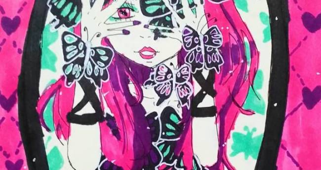 ダイソーの3色のイラストマーカーで女性とアゲハ蝶を魅惑的に塗りました。下書きはシャープペンシルで描き、線画は、ぺんてるのゲルインクボールペンで描きました。ハイライトは、シグノのホワイトで描きました。