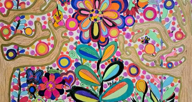 非現実,屋外,自然,春,3月,4月,赤,オレンジ,黄色,緑,水色,青,紫,動物,植物,昆虫,明るい,たのしい,かわいい,わくわく