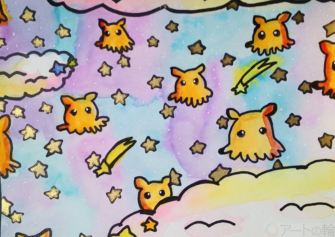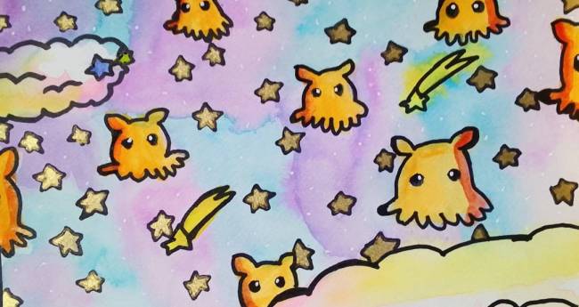空にメンダコが浮いて飛んでいる様子をシャープペンとマッキーペンのペイントマーカーの金色とシグノのホワイトとイオンで買った油性ペンとホルベインの透明水彩絵の具で可愛くゆるふわに描きました。