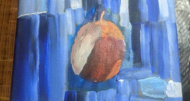 青の林檎という題材で林檎をオレンジと赤で描きました
