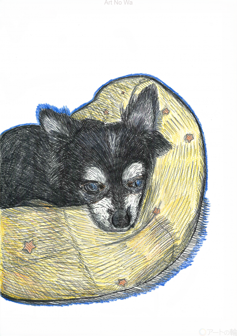 我が家の愛犬、オスのチワワ、ルカです。以前投稿した、ジュピターとアリスとの間に生まれた子供です。現在13歳、誕生日を迎えれば14歳になります。人間で言えばおじいちゃんであり、実際目がほぼ見えておらず、心臓が弱かったり認知症も患っています。ただ、ゆっくりながらも自分の足で歩けて、ご飯をちゃんと食べられて、しっかり排泄も出来ています。そして今でも頭や身体を撫でると、嬉しそうに尻尾を振ってくれます。自分にとっては、ある意味弟のような存在です。今回描いてみて、母親のアリスに似てきたと、改めて感じました。以前はチョコフォやジュピターと喧嘩をすることもありましたが、オス一匹だけになり、性格も目つきもすっかり柔らかくなりました。どうか両親やチョコフォの分まで、長生きして欲しいです。
