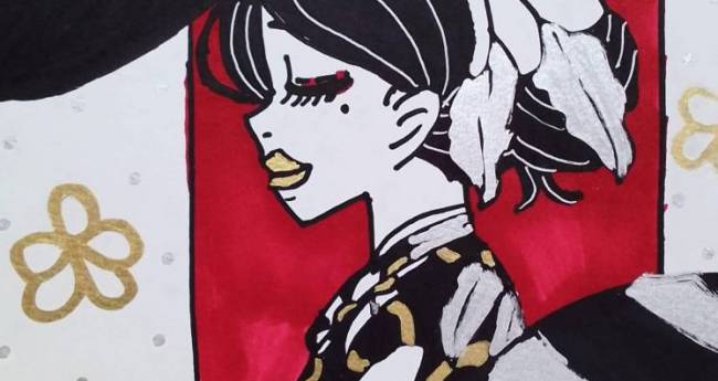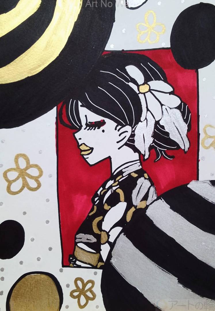 イラストマーカーとイオンで買った油性ペンとマッキーペイントマーカーの金と銀を使って、コブシの花を頭につけている着物の女性を上品に描いてみました。