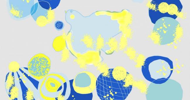 鳥が水辺で遊んでいる様子をイメージして描きました。光と水があることの嬉しさがうまく伝わるといいなと思います。