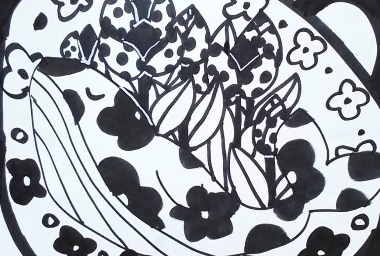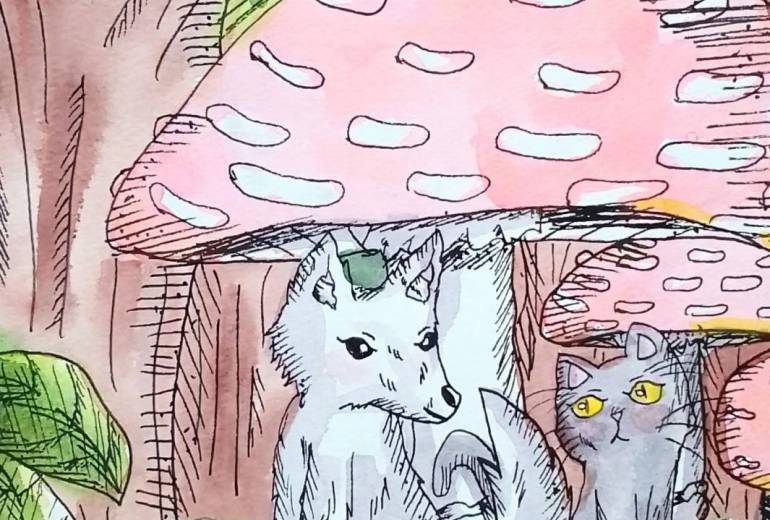 猫と一緒にサクランボ狩りをしているロリータ服の女の子を描いてみました。ホルベインの透明水彩と通販で買った固形水彩とセリアの色鉛筆とシャープペンとプロッキーとシグノのホワイトを使って描きました。