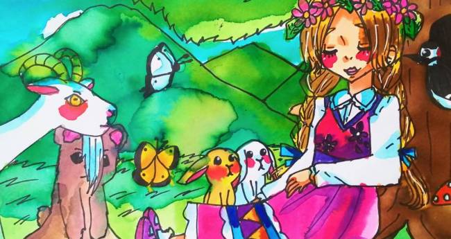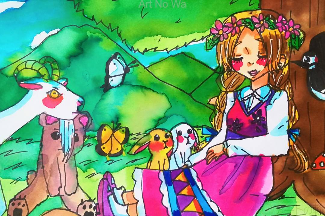 自然で見晴らしのいい森の中で動物達と戯れている女の子を描いてみました。セリアのカラーインクと黒いマジックペンとシグノのホワイトとシャープペンなどを使って描きました。