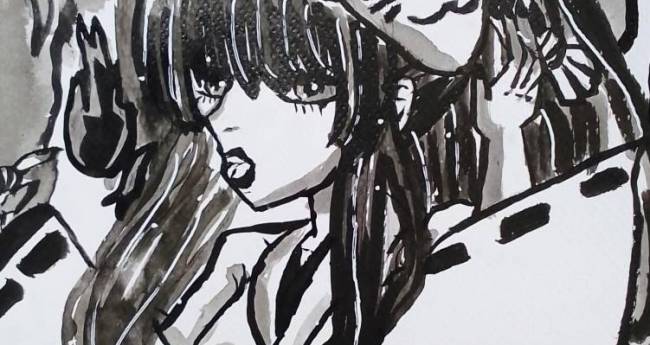 能力で火を出している狐のお面の巫女の少女を100均の墨汁で色や線画を描いて塗り、シャープペンで下書きし、ハイライトは、シグノのホワイトで付けて描いてみました。紙はフライングタイガーの水彩紙です。