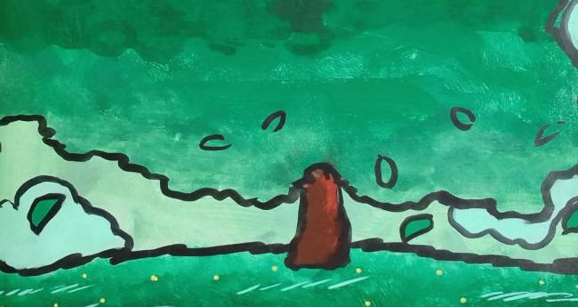 一本の大きな木に自然豊かに風が吹いている様子をマジックペンやアクリルマーカー、アクリル絵の具などを使って描いてみました。