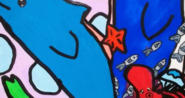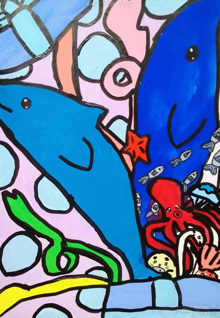 シャープペンシルとシグノのホワイトとマジックペンとポスターカラーなどを使って、プレゼント箱から飛び出している海の生き物を描いてみました。