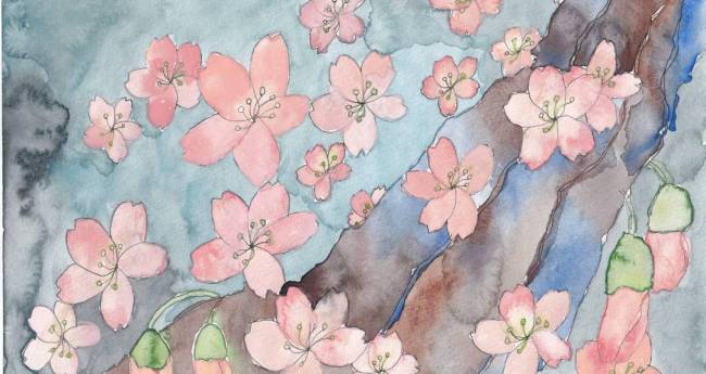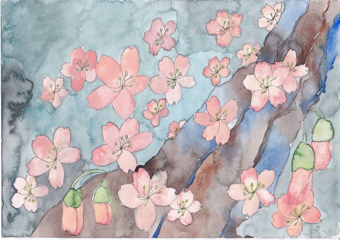 寒い冬が終わり、温かい風が吹いて春になった、色のない景色が変わって薄いピンク色が広がっていく不思議を描きました。