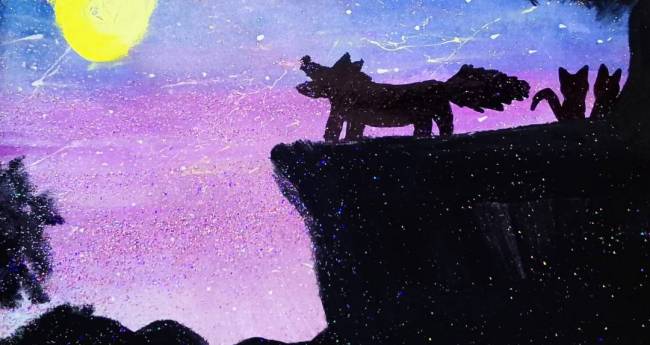 満月に向かって吠えている狼を描いてみました。キラキラのところはネイルのグリッターです。