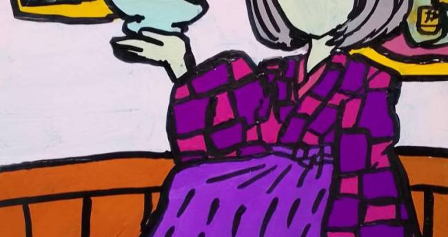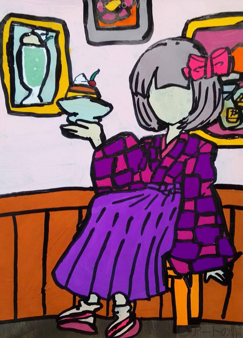 昭和や大正などのデザートを満喫している袴の女性を描いてみました。